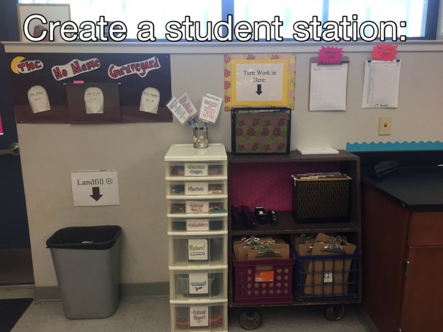 Before creating this student centered area, I had many student materials scattered around the room. I now have a student station with the materials that they will need to access on a daily basis. This station includes: art supplies, office supplies, clipboards, the homework bin and various sign-up sheets that may need to be referenced. (You may notice that I moved my “no name graveyard” to this spot—I think it’s much more fitting.)