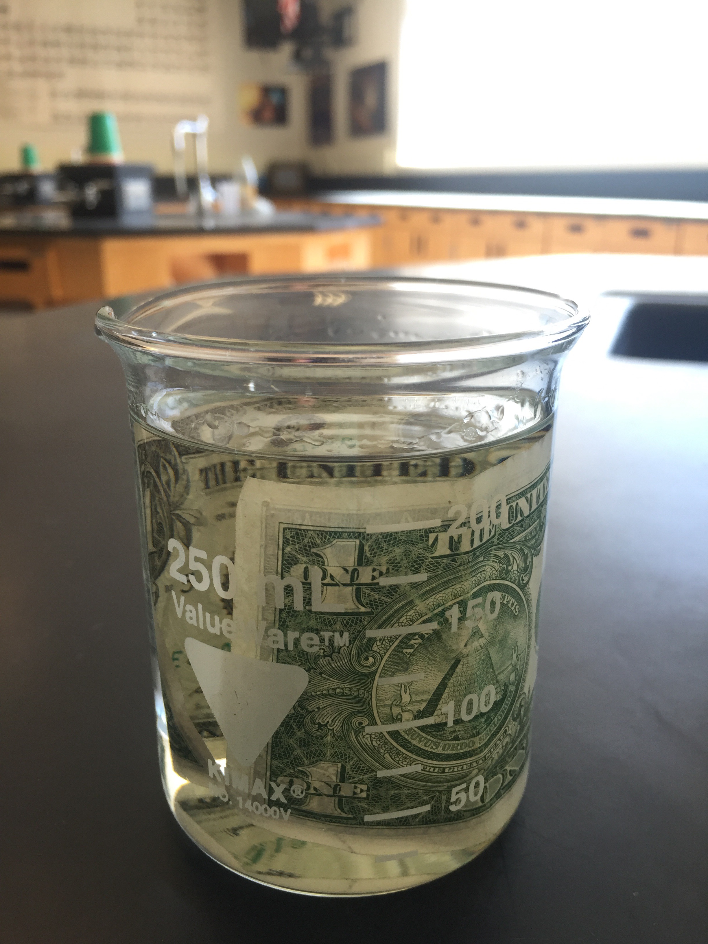 This is a great demo that is a flashy and exciting for students to see. Be sure to practice proper safety when doing any demo with fire in a lab: have a fire extinguisher next to you and ready to go. Wear safety goggles, tie hair back, do not wear any loose/draped clothing and make sure students are far enough away from the flame. Be sure to remove the fuel source before lighting the bill on fire (move the beaker filled with the isopropyl solution far away from where the demo is taking place, move the bill away from the beaker before lighting it on fire). To make this demo a little more interesting, you could always ask to borrow a dollar from one of your students and see how your class reacts when you light it on fire!! You might want to have a dollar on hand to give them just in case you singe theirs :)